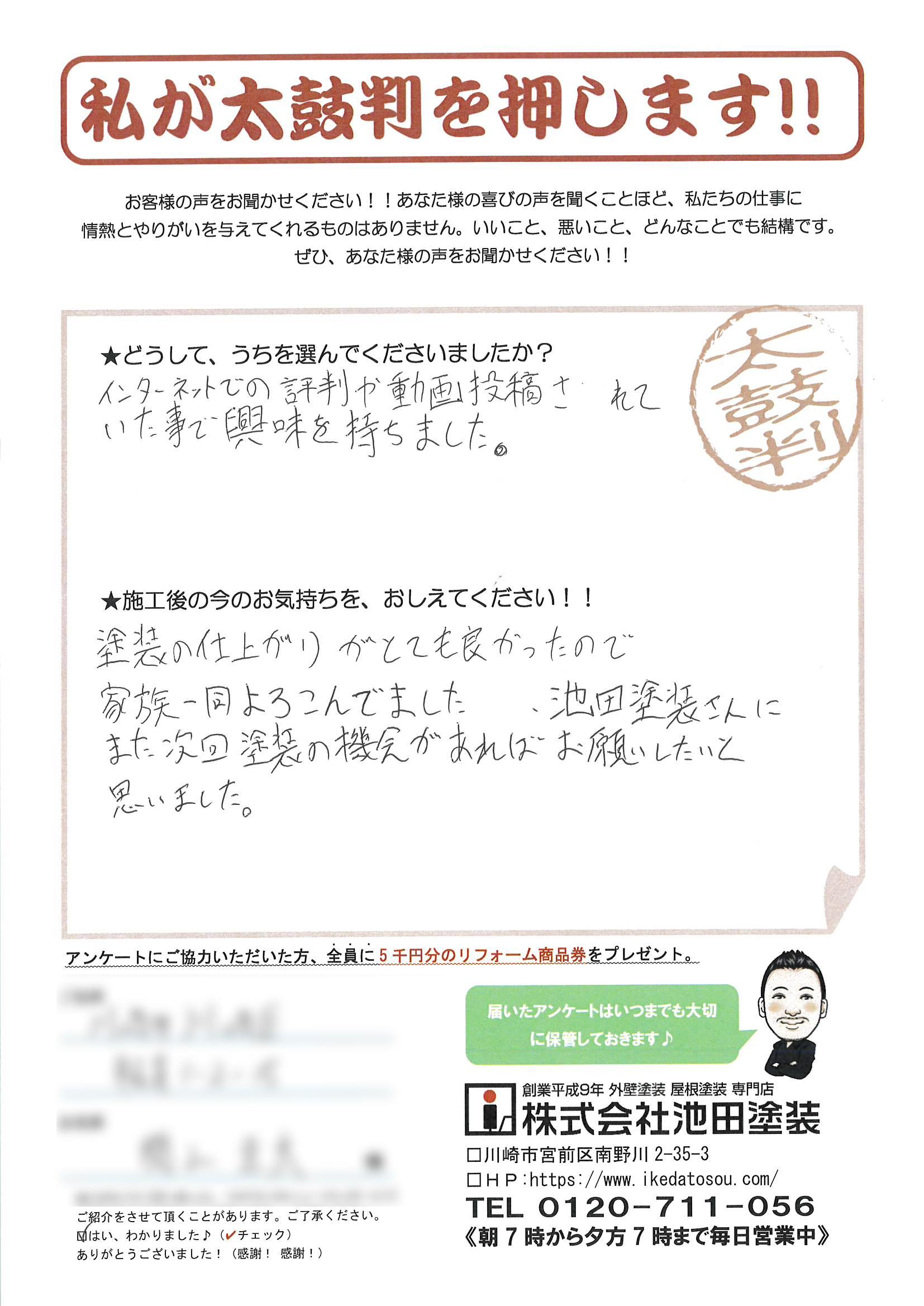 「塗り替えリフォームを通して川崎・横浜のすべての方々の住まいの安心と安全を支える」をモットーにしています。